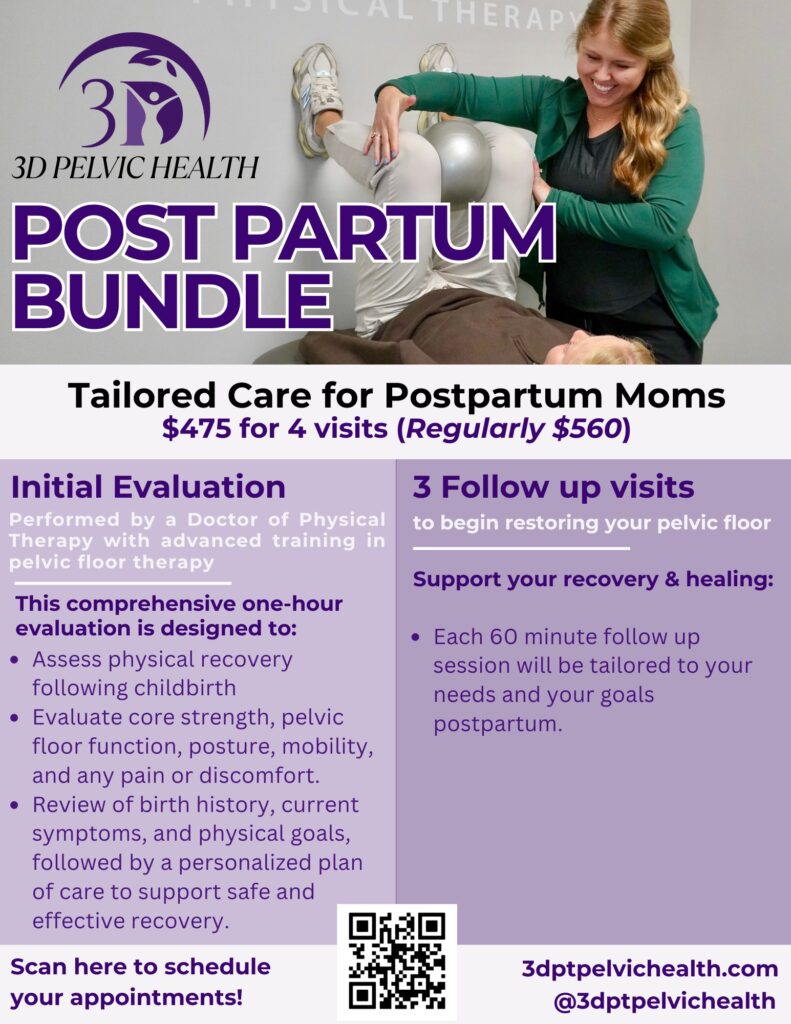 With this postpartum bundle, you will receive trusted care and experienced expertise to teach you what to do after birth to ensure prevention of incontinence, pain, prolapse, diastasis recti, promote healing and return to safe exercise.